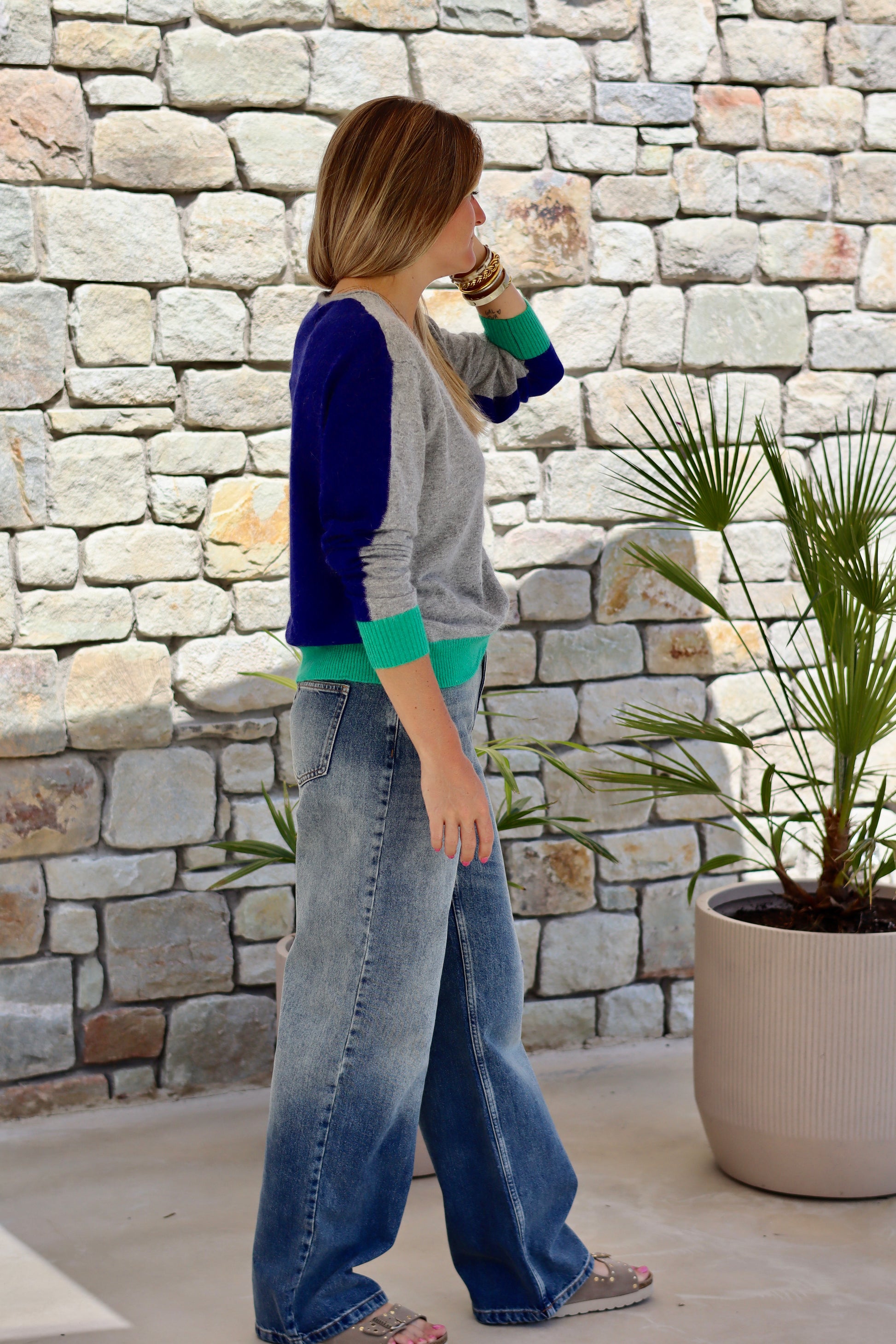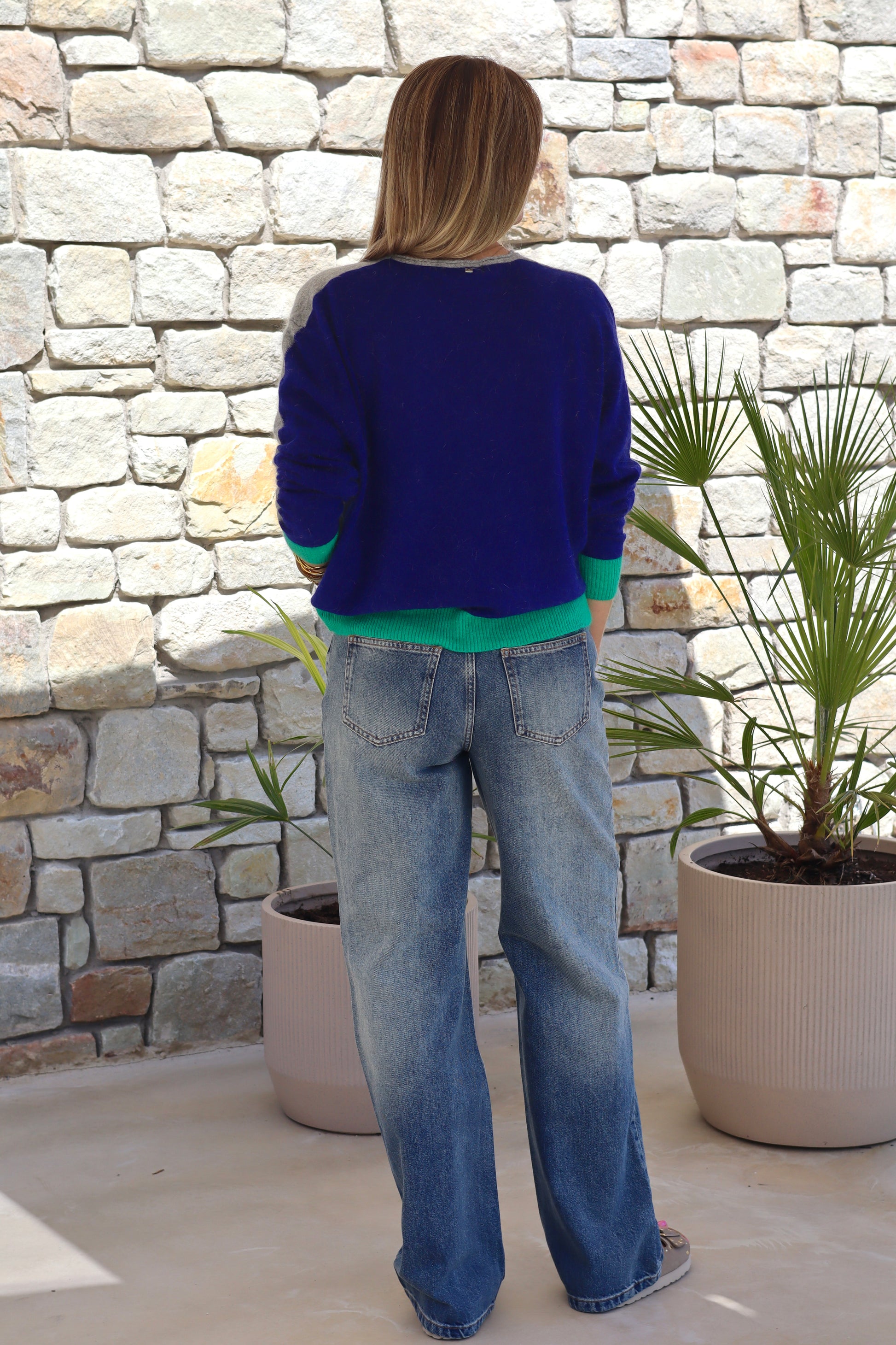 - Bleu royal dans le dos, vert aux poignets et dans le bas du pull et gris chiné